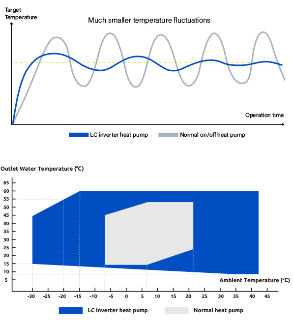 The twin-rotor compressor with full DC inverter EVI technology, ensures the unit running stably at ambient temperature from -25°C to 43°C based on different requirements of heating/cooling, DHW, and working voltage range from 170V-254V(1ph) and 320V-460V(3ph).
